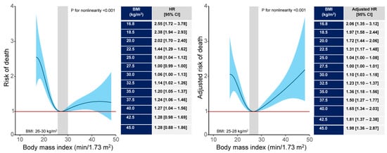 Nonlinear association between body mass index (BMI) with 10-year all-cause mortality in unadjusted (left panel) and adjusted (right panel) analysis. The spline curves show the risk of mortality across the whole spectrum of BMI values. The shaded areas show the BMI values associated with the lowest 10-year mortality. In unadjusted analysis, the BMI values lower than 26 kg/m2 and higher than 30 kg/m2 were associated with increased risk of mortality. In adjusted analysis, the BMI values lower than 25 kg/m2 and higher than 28 kg/m2 were associated with the increased adjusted risk of mortality. The inserted tables on the right side of each graph show hazard ratios (HRs) with 95% confidence interval (CI) for all-cause mortality in various BMI values.