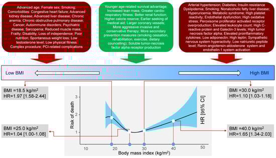 Association between body mass index and all-cause mortality. Upper part: Risk factors and comorbidities that tend to cluster in various parts of the body mass index scale. Lower part: Restricted cubic spline curve showing the relationship between body mass index and the risk of all-cause mortality. BMI = body mass index; CI = confidence interval; HR = hazard ratio; PCI = percutaneous coronary intervention.