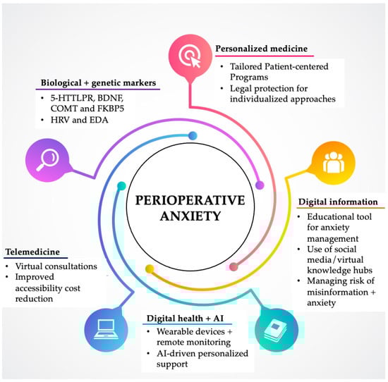 The pre-surgery period is often marked by the progression of pathology, while the anticipation of anesthesia and surgery heightens stress on the body. Research into the interaction of these factors offers valuable insights into the origins and mechanisms of perioperative anxiety. Bespoke medication strategies can reduce overall anxiety levels and minimize side effects. Biochemical and physiological studies can bring better understanding of processes occurring in the human body when experiencing perioperative anxiety. Research in neurophysiology and brain plasticity can help us understand the interplay between stress hormones and brain recovery mechanisms [76]. In addition, emerging evidence suggests that genetic and biological markers, such as variations in the serotonin-transporter-linked promoter region (5-HTTLPR) gene [77] and increased inflammatory markers [78], may predict susceptibility to anxiety. The brain-derived neurotrophic factor (BDNF), catecholamine-O-methyltransferase (COMT), and FK506-binding protein 5 (FKBP5)-gene are other possible genetic markers for altered anxiety levels [79,80,81]. Ultimately, researchers have explored a link between lower heart-rate-variability (HRV) and the presence of anxiety [82]. With HRV-monitoring tools at hand via smartphone applications, these might help identify patients experiencing higher-than-normal stress. Another biological marker with potential to indicate stress is electrodermal activity (EDA). Biomarker research in non-clinical settings has shown encouraging results regarding correlation with established stress questionnaires [83]. While promising, these findings currently have limited clinical application and are primarily used in research or in e-health applications. Future studies should focus on integrating these markers into practical, predictive models for perioperative care.