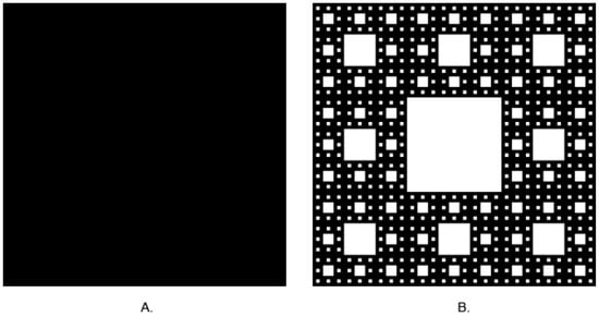 Figure 1. (A) Square—FD = 2, (B) Sierpinski carpet—FD ≈ 1.8928 (Generated by https://codinglab.huostravelblog.com/math/fractal-generator/ accessed on 1 January 2024).