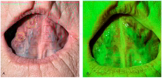 Figure 2. Region of interest (ROI) selection: (A) white light photography, (B) green light photography, red squares—ROIs, yellow squares—additional ROIs.