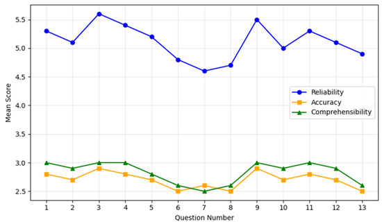 | Question | Domain | Reliability (Mean ± SD) | Accuracy (Mean ± SD) | Comprehensibility (Mean ± SD) | Word Count (Mean ± SD) |