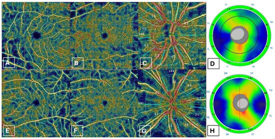 The right eye (A–D) of a patient with PCME diagnosis from the study group shows normal vessel density in superficial and deep capillary plexuses at OCTA (A,B), and increased vessel density in the radial peripapillary capillary plexus at OCTA (C). SD-OCT shows increased global RNFL thickness (101 micron) (D). The left eye (E–H) of a healthy patient of the control group shows normal vessel density/VD in superficial, deep retinal capillary plexuses, and normal vessel density in radial peripapillary capillary plexus at OCTA (E–G). SD-OCT shows normal global RNFL thickness (96 micron) (H).
