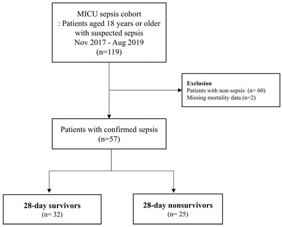 All patients aged ≥ 18 years with suspected sepsis admitted to the MICU were eligible to be included in the MICU sepsis cohort. Among 119 consecutive patients in the MICU sepsis cohort, patients diagnosed with sepsis according to the Sepsis-3 guideline were included in this study. After excluding patients for whom 28-day mortality data were missing, the study ultimately included 57 patients with confirmed sepsis. These patients were categorized into survivors and nonsurvivors based on their outcomes after 28 days of ICU admission.