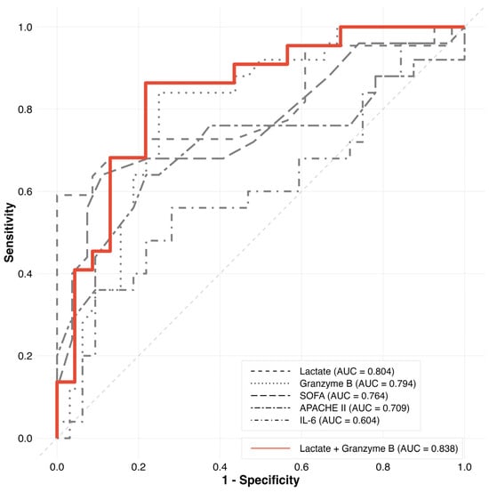 The SOFA and APACHE II scores, as well as lactate and IL-6 levels, were identified as prognostic factors in patients with sepsis [,,,]. The ability of these factors, including plasma granzyme B, to predict 28-day mortality in patients with sepsis was statistically significant, except for IL-6. Granzyme B demonstrated a robust AUROC of 0.794, comparable to lactate’s AUROC of 0.804. Compared to granzyme B, SOFA and APACHE II scores exhibited smaller AUROC values of 0.764 and 0.709, respectively. However, these differences in AUROCs between granzyme B levels, SOFA, and APACHE II scores were not statistically significant. The combined index of lactate and granzyme B demonstrated the highest AUROC among all investigated predictors (Figure 2 and Table 2).