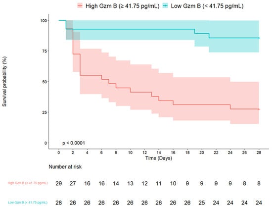 Kaplan–Meier curves for 28-day survival rate in patients with sepsis: High-Gzm B group vs. Low-Gzm B group.