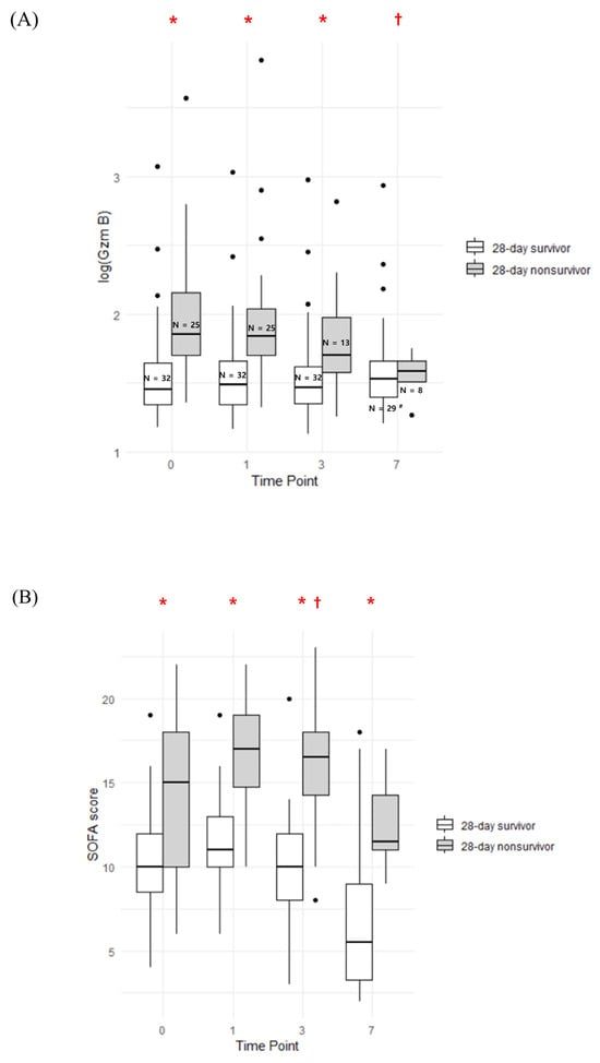 Serial trend of plasma granzyme B (A) and SOFA score (B). (A) * p < 0.05 for the difference in log10(Granzyme B) in 28-day survivors vs. 28-day nonsurvivors at a specified time point. † p < 0.05, as analyzed by generalized estimating equations, for the change in log10(Granzyme B) from time point 0 to a specified time point in 28-day survivors vs. 28-day nonsurvivors. # There were 3 cases of missing blood samples. (B) * p < 0.05 for the difference in SOFA score in 28-day survivors vs. 28-day nonsurvivors at a specified time point. † p < 0.05, as analyzed by generalized estimating equations, for the change in SOFA score from time point 0 to a specified time point in 28-day survivors vs. 28-day nonsurvivors.