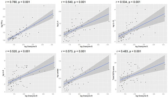 Significant positive correlations were observed between log granzyme B and various inflammatory cytokines, including IFN-γ (r = 0.780), IL-4 (r = 0.540), IL-10 (r = 0.534), and IL-6 (r = 0.520). Additionally, log granzyme B exhibited fair correlations with lactate (r = 0.573) and the SOFA score (r = 0.483) (Figure 5). However, no significant correlations were observed between log granzyme B and C-reactive protein or procalcitonin.