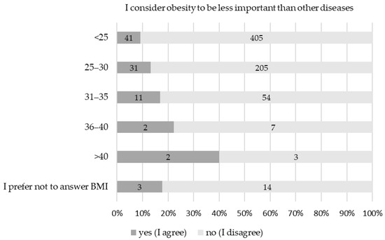 There were, however, significant differences between HCPs’ areas of expertise: surgeons and dentists were less interested in the subject (p = 0.001), less often considered obesity as a disease (p = 0.008), less often knew the obesity definition (p < 0.001), and less often knew and/or used the ICD obesity code (p < 0.001 for both). The opposite goes for PCPs, followed by specialists in internal medicine. Importantly, physicians with a higher BMI also found obesity less important than other diseases (p = 0.036), as shown in Figure 1.
