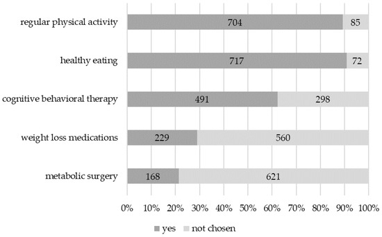 When asked about the most effective weight loss method, physicians still most frequently chose healthy eating (90.9%; n = 717) and regular physical activity (89.2%; n = 704), whereas cognitive behavioral therapy (CBT), weight loss medications, and metabolic surgery were less frequently chosen (Figure 2). CBT was more often chosen by female doctors (p < 0.001) and weight loss medications were more often chosen by PCPs and internal medicine specialists (p < 0.001).
