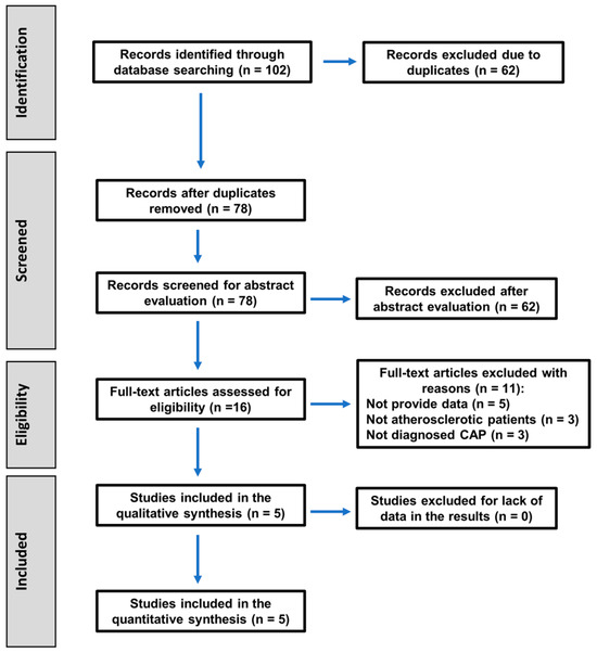 The baseline search recovered 102 titles. After the removal of duplicates, 78 articles remained, of which 62 were excluded after reading their abstracts for being unrelated to the topic, and 16 were selected for their full text. After full-text reading, 11 articles were excluded for the following reasons. Five did not provide the necessary data [12,14,31,32,33]. In three studies, some patients in the experimental group did not have atherosclerosis [34,35,36], and the other three studies did not establish a radiographic diagnosis of CAP [37,38,39]. The excluded articles and the reasons for their exclusion are shown in Table 1.