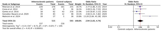 Concerning the atherosclerotic condition of patients in the atherosclerosis group, two studies included patients who had suffered cardiovascular events (CVEs) associated with atherosclerosis [15,42]. Another study used a CT scan [40], another one used coronary angiography [41], and the fifth one used Doppler sound to assess the carotid wall’s thickness [43].