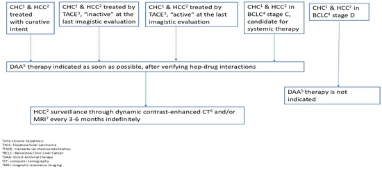 The first category of patients, those with hepatocellular carcinoma treated with curative intent (through resection procedures or RFA) and those with inactive HCC after chemoembolization, clearly benefit from treatment with direct antivirals. Most data in the literature suggest that antiviral treatment reduces the frequency of recurrence, according to the studies discussed previously [16,25,26,29,43,44,45,46,47,48,49].