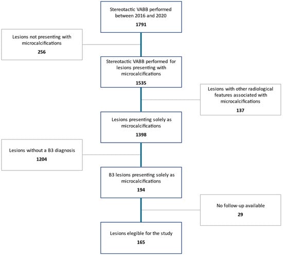 As detailed in Figure 1, out of a total of 1791 stereotactic VABB procedures recorded in our database in the inclusion timeframe, 256 cases were excluded because the target lesion was not related to microcalcifications, 137 because of the presence of other radiological features associated with microcalcifications, and 1204 because these lesions were not diagnosed as B3. Among the 194 B3 lesions presenting solely as microcalcifications, 29 were further excluded due to unavailability of follow-up data.