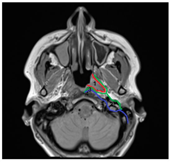 1. Pharyngomucosal space (PMS), 2. parapharyngeal space (PPS), 3. retropharyngeal space (RPS), and 4. prevertebral space (PVS). Red line: pharyngobasilar fascia; green line: middle layer of deep cervical fascia; and blue line: deep layer of deep cervical fascia.