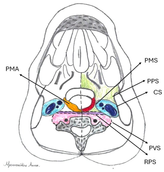 Sound knowledge of pertinent surgical anatomy is of paramount importance in order to access all involved neck spaces [,]. The pharyngeal mucosal space (PMS) has been described as the most superficial neck space, lying deep in the pharyngeal mucosa, anteromedially to the parapharyngeal space, and directly anterior to the retropharyngeal space. Its clinical significance has not been recognized until recently, through cross-sectional imaging studies. Anatomically, it represents the area of the nasopharynx and oropharynx on the inner side of the buccopharyngeal fascia. It is located between the pharyngeal mucosa (superficially) and the investing layer of the deep cervical fascia (pharyngobasilar fascia) (deep). The latter surrounds the pharyngeal constrictors. It extends from the skull base to the lower cricoid border, involving the naso-oro-hypopharynx. It is bordered by the superior constrictor muscles’ aponeurosis superiorly, where it merges with the middle layer of deep cervical fascia (Figure 1). PMS consists of five layers, forming the pharyngeal wall. From the internal to the external layers, they include the following: 1. mucosal membrane; 2. submucosa (containing loose areolar tissue, which facilitates deglutition, lymphoid tissue, and minor salivary glands); 3. dense pharyngobasilar fascia; 4. superior constrictor muscles of the pharynx; and 5. buccopharyngeal fascia (outer lining of the space). Dense connective tissue is present only on the deep surface of this layer (deep cervical fascia) [,,,,]. Some studies suggest that the peritonsillar space is virtually part of the PMS [,,]; however, more recent studies define them as separate spaces [].