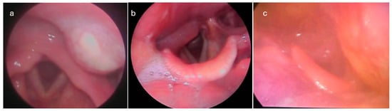 Table 3 tabulates the summary of patients with PMAs’ physical examination findings. One-sided lateral pharyngeal wall edema was invariable; pyriform sinus, vallecula, uvula, peritonsillar swelling, and unilaterally enlarged tonsil were noticed in 41%, 27%, 27%, 26%, and 18% of patients, respectively, while nasopharyngeal edema and adenoiditis were found in three patients (Figure 4). Tenderness during palpation of the larynx was noted in all patients. The most common laryngeal endoscopic finding was arytenoid edema (20%), whereas the glottic and subglottic areas were spared. Neck swelling was present in 25% of patients.