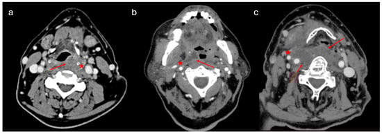 CT images of different categories of DNIs: (a) left-side PMA protruding into the pharyngeal lumen, passing medially to the hyoid bone; (b) right-side peritonsillar abscess, extending to the parapharyngeal space towards the right carotid artery and jugular vein; and (c) extended right-side parapharyngeal and retropharyngeal abscess. Arrows and stars indicate the margins of the abscess.