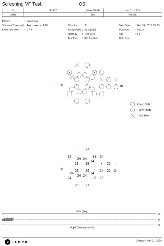 - Nishijima, E.; Hosaka, D.; Ogawa, S.; Itoh, Y.; Noro, T.; Okude, S.; Sano, K.; Yoshikawa, K.; Tatemichi, M.; Nakano, T. Comparison of Glaucoma Detection Performance of Binocular Perimetry Screening Program Using imo Perimetry with Frequency Doubling Technology. Transl. Vis. Sci. Technol. 2024, 13, 9. [Google Scholar] [CrossRef]