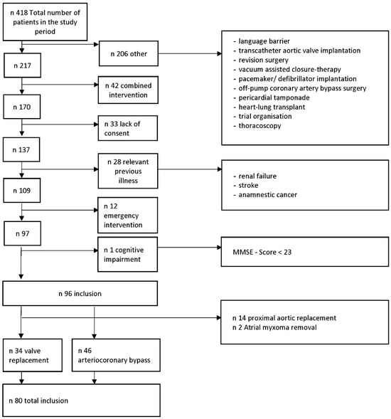 Figure 2). We followed this procedure to avoid any selection bias or missing to enroll an eligible patient. Due to the high number of emergency and/or combined cardiac surgical procedures, this resulted in a relatively high number of patients being not eligible for our study due to the exclusion criteria. Enrolled patients underwent elective arterio-coronary bypass (N = 46) or heart valve replacement (N = 34) at the LMU University Hospital, LMU, Munich. All patients were perfused via cardiopulmonary bypass (CPB) during the procedure. The exclusion criteria for the study were the following: