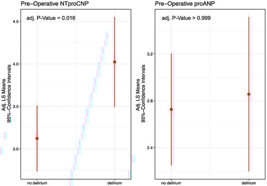 Figure 3). The adjusted mean difference of the preoperative levels of NT-proANP between patients with and without postoperative delirium was 0.13 ± 0.41 pmol/L (effect size: d = 0.08; unadjusted: 0.18 ± 0.43, d = 0.10). For NT-proCNP, the adjusted mean difference was 0.90 ± 0.33 pmol/L (effect size: d = 0.644; unadjusted: 0.92 ± 0.34, d = 0.63). Later in the individuals, natriuretic peptides did not show decisive results (