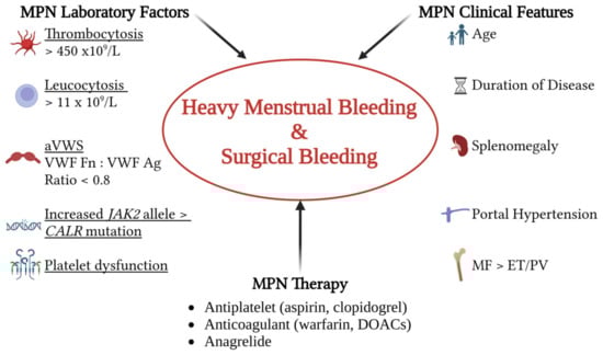 Clinical and laboratory factors to consider in the assessment of bleeding risk for women of child-bearing age with MPNs [21,22,24,26,27,28,29,30,31]. HMB and risk of excess bleeding with surgery are often underestimated issues for clinical practice. MPN, myeloproliferative neoplasm; MF, primary myelofibrosis; ET, essential thrombocythemia; PV, polycythemia vera rubra; VWF Fn, assay that measures VWF activity; VWF: Ag, VWF antigen; VWF, von Willebrand Factor; JAK2, JAK2 V617F allele burden; CALR, calreticulin gene mutation; DOACs, direct oral anticoagulants; aVWS, acquired von Willebrand syndrome.