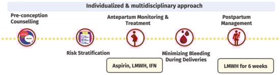 Ideally, patients with predictive factors for pregnancy-related complications should be stratified and managed accordingly. However, the identification of reliable predictive factors remains an area requiring further investigation. Current thrombotic risk stratification models for MPN, such as components of the IPSET score, are not applicable for predicting complications in pregnancy [77]. In a study evaluating 121 pregnancies in women with ET, a history of prior pregnancy loss was significantly associated with subsequent pregnancy complications, whereas factors such as JAK2 V617F and CALR mutation status, maternal age, and pre-pregnancy blood counts showed no significant association [78]. Additionally, diabetes mellitus was associated with fetal loss and preclampsia in ET pregnancies [77]. The impact of the JAK2 V617F mutation on pregnancy outcomes has been inconclusive, with earlier studies suggesting a correlation between the mutation and pregnancy complications [79,80] while more recent studies found no significant association [73,77,78].
