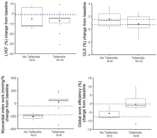Evolution at 1 year of the parameters of the left ventricular systolic function. The dotted horizontal lines represent the 95% confidence interval of the evolution at 1 year in the group without Tafamidis according to the article by Giblin et al. [11].