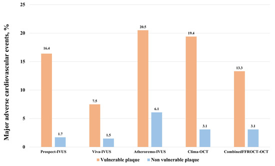 OCT-derived studies do also stress the prognostic significance of vulnerable plaques in CAD. The CLIMA study included 1003 patients undergoing clinically indicated coronary angiography with non-obstructive lesions in the proximal left anterior descending artery. Those lesions exhibiting high-risk features identified on OCT (such as a minimum lumen area [MLA] < 3.5 mm2, fibrous cap thickness < 75 µm, lipid arc > 180°, and macrophages) demonstrated a 7.5-fold higher risk of cardiac death or target segment-related myocardial infarction at 1 year compared to patients with non-vulnerable features [38]. The COMBINE OCT-FFR trial showed that among patients with ≥1 fractional flow reserve (FFR)-negative lesions, TCFA-positive patients (OCT-defined fibrous cap thickness of ≤65 μm with a lipid arc of >90°) represented 25% of this population and were associated with a fivefold higher rate of MACE despite the absence of ischemia [39]. Two additional large observational studies [40,41] demonstrated that the presence of vulnerable plaque characteristics detected by OCT was associated with an increased risk of MACE. Figure 1 displayed the rates of major adverse vascular events for patients with and without vulnerable plaques among the main IVUS and OCT studies.