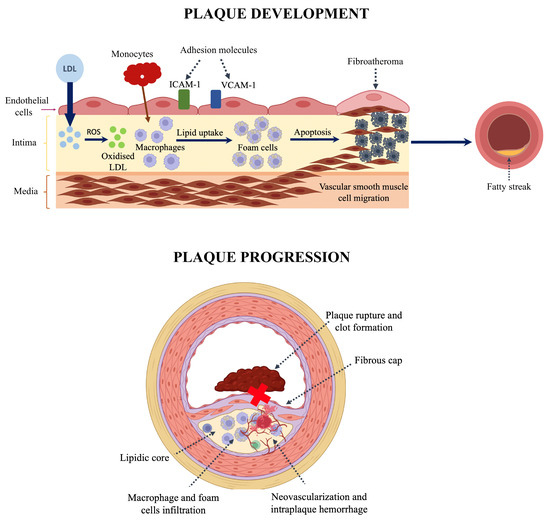 (Upper panel): Pathophysiology of atheroma plaque formation: 1. Endothelial dysfunction leads to increased LDL permeability and reduced nitric oxide production. 2. LDL molecules are oxidised in the subendothelial space (ROS: reactive oxygen species), and they promote the upregulation of adhesion molecules ICAM1 (intercellular adhesion molecule 1) and VCAM1 (vascular cell adhesion molecule 1). 3. Monocytes bind to these molecules and migrate into the vessel wall, where they convert into foam cells. 4. Excessive cholesterol uptake can disrupt autophagy regulation, induce cytotoxic effects, and ultimately lead to cell death. Additionally, inflammatory pathways—mediated by pro-inflammatory cytokines such as IL-18 and IL-6, as well as microRNAs—further drive the onset and progression of atherosclerosis. 5. Fatty streak is developed as an early stage of atherosclerosis, with no significant luminal narrowing. (Lower panel): Pathophysiology of vulnerable plaque development and progression: 1. Formation of necrotic core due to foam cell apoptosis and necrosis. 2. Thinning of fibrous cap: activated macrophages release matrix metalloproteinases and other enzymes that degrade extracellular matrix. 3. Neovascularization and intraplaque hemorrhage: immature microvessels rupture. 4. Plaque rupture and thrombosis: core exposure triggers thrombus formation.