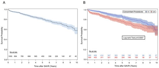 Overall 30-day mortality was 0.3% (n = 3) and 0.2% (n = 1) in isolated RD-SAVR (1/500). Survival at 1-, 5- and 10-year FU was 95% (95% CI: 93–96%), 81% (95% CI: 78–84%) and 58% (95% CI: 51–64%), respectively (Figure 1A). A higher mortality was observed for patients undergoing concomitant procedures (log-rank test p < 0.001; Figure 1B).