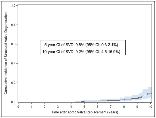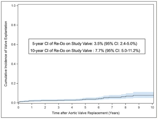 The same meta-analysis published by Williams et al. reports eight cases (0.4%; 95% CI, 0.0–1.1; I2 = 73%) of structural valve deterioration (SVD). Endocarditis was reported in 25 patients (1.1%; 95% CI, 0.5–1.9; I2 = 55%) and re-operation with valve explantation was observed in 47 patients (2.3%; 95% CI, 1.7–3.1; I2 = 7%) []. We report an overall cumulative incidence of re-operation or re-intervention on the study valve at 5 and 10 years of 3.5% (95% CI: 2.4–5.0%) and 7.7% (95% CI: 5.0–11.2%); re-operation due to valve degeneration was performed in 0.6% (95% CI: 0.2–1.7%) at 5 years and 3.6% (95% CI: 1.6–7.0%) at 10-year follow-up.