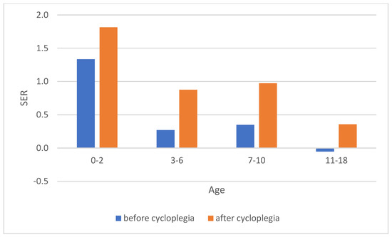 Refractive errors before and after cycloplegia. Abbreviations: SER: spherical equivalent refraction.