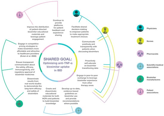 Relevant, accessible education—for patients and practitioners—must be prioritized. Educational efforts from pharmaceutical providers as well as peer-to-peer sharing should target all areas of the multidisciplinary team in IBD to support confidence in the concept and clinical suitability of biosimilar anti-TNF-α medicines and be able to assuredly convey this information to patients to support successful treatment outcomes. By implementing such strategies, we can better leverage the benefits of biosimilar anti-TNF-α medicines and better support the ‘top-down’ approach to IBD treatment, ultimately improving long-term disease management and patient outcomes, as well as paving the way for the future biosimilar landscape in IBD.