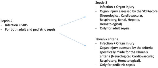 The relationship between obesity and outcomes in pediatric sepsis is complex and less well-defined compared to adult populations []. Several factors unique to pediatric sepsis contribute to these inconclusive results, including physiological differences between children and adults, variations in immune responses, comorbidities, developmental physiology, and inconsistencies in study designs []. Notably, pediatric studies on obesity and sepsis tend to be smaller in scale and often lack standardization in their definitions of both obesity and sepsis [,,]. A critical distinction between adult and pediatric sepsis lies in their respective definitions, which have evolved differently over time. From 2005 until 2024, pediatric sepsis was defined according to the 2005 International Pediatric Sepsis Consensus Conference. This definition, referred to as Sepsis-2 (Figure 1), was based on systemic inflammatory response syndrome (SIRS) criteria and was shared with adult sepsis at the time []. However, the definition of adult sepsis was updated in 2016 to Sepsis-3, which introduced significant changes. Under Sepsis-3, sepsis was defined as a suspected or confirmed infection with life-threatening organ dysfunction, assessed using the Sequential Organ Failure Assessment (SOFA) score, with a threshold of at least two points (Figure 1) []. For nearly eight years, these differing definitions created a gap in the criteria for diagnosing sepsis between adults and children. Only recently, in March 2024, a new International Consensus Criteria for Pediatric Sepsis and Septic Shock was introduced, aligning pediatric definitions more closely with Sepsis-3 []. This updated definition is based on the Phoenix Sepsis Score, which identifies sepsis in children as a suspected or confirmed infection with life-threatening dysfunction by evaluating four systems—respiratory, cardiovascular, coagulation, and neurological (Figure 1). Septic shock, under this new definition, is characterized as sepsis accompanied by cardiovascular dysfunction indicated by at least one or more points in the cardiovascular organ system. Importantly, as with Sepsis-3, the Phoenix definition requires acute organ dysfunction for the diagnosis of sepsis, making all pediatric sepsis cases equivalent to “severe sepsis” under previous definitions [,].