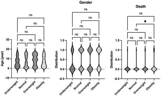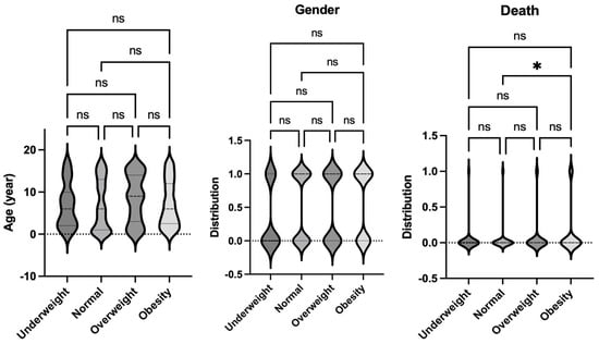 Comparison of demographics and mortality of septic patients based on Phoenix score per body habitus. Age, gender, and mortality were compared among underweight, normal, overweight, and obese patients. Dunn’s multiple comparison tests were used for age. For gender and mortality, logistic regression analysis was performed. * p < 0.05. ns = not significant.