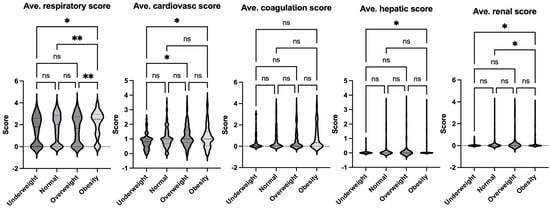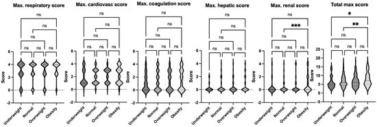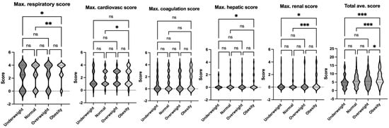 Comparison of maximum organ scores of septic patients based on Phoenix score per body habitus. Dunn’s multiple comparison tests were used. *, **, and *** denote p < 0.05, p < 0.01, and p < 0.001, respectively. ns = not significant.