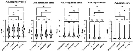 Comparison of average organ scores of septic patients based on Phoenix score per body habitus. Dunn’s multiple comparison tests were used. * p < 0.05. ns = not significant.