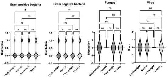Comparison of frequency of bacterial, viral, and fungal sepsis per Phoenix criteria per body habitus. Logistic regression analysis was performed. * p < 0.05. ns = not significant.