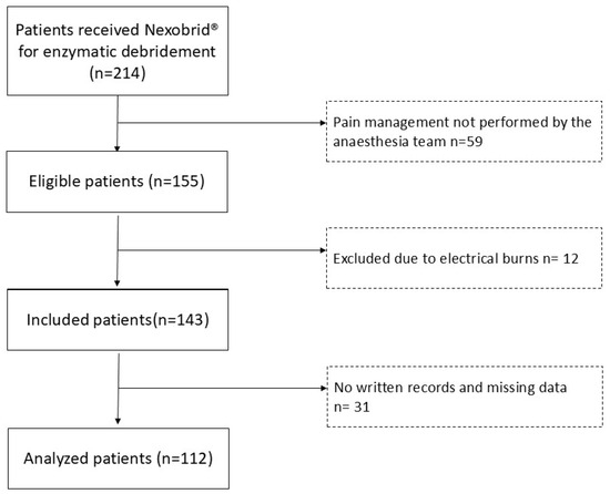 During the time of the study, 214 patients received Nexobrid® for enzymatic debridement in our burn unit. Of these, 59 patients were excluded because pain management was not performed by the anaesthesia team. They were patients admitted to the Burn Intensive Care Unit (ICU) that required mechanical ventilation and sedation, and their pain management was addressed by Burn ICU intensivists. Out of the remaining 155 patients, 12 patients were not enrolled because they had electrical burns and 31 patients were excluded because there were no written records during the use of Nexobrid®. Thus, we had 112 eligible patients for the study (Figure 1).