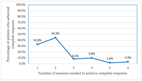 A multivariate statistical analysis showed two significant factors affecting the response type, smoking status, with an odds ratio = 0.015 and p-value < 0.001, and the number of treatment sessions required to achieve a complete response, with an odds ratio = 0.317 and p-value < 0.001. Figure 2 illustrates that a higher number of treatment sessions was associated with a lower likelihood of achieving a complete response. Patients who achieved a complete response generally required fewer treatment sessions, while patients who did not achieve a complete response underwent more treatment sessions.