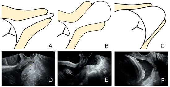 Morphologic classification of prolapsed fetal membrane. (A) We defined type A: the effacement of the cervix has not progressed, and the dilation of the external cervical os is wider than the width of the prolapsed fetal membrane. (B) We defined type B: the effacement of the cervix has not progressed, and the dilation of the external cervical os is smaller than the width of the prolapsed fetal membrane. (C) We defined type C: the effacement of the cervix has progressed, and the prolapsed fetal membrane has formed a dome shape. (D–F) are examples of type A, B, and C, respectively.