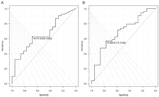 A receiver-operating characteristic (ROC) curve to calculate cutoff values for a prolonged pregnancy period of <7 days. (A) The width of the external os: the cutoff value was 14.7 mm. The area under the curve (AUC) of 0.651 (95% confidence interval [CI]: 0.520−0.784), sensitivity 0.623, and specificity 0.682. (B) The maximum width of the prolapsed fetal membrane: the cutoff value was 37.5 mm. AUC of 0.683 (95% CI: 0.549–0.816), sensitivity 0.566, and specificity 0.773.