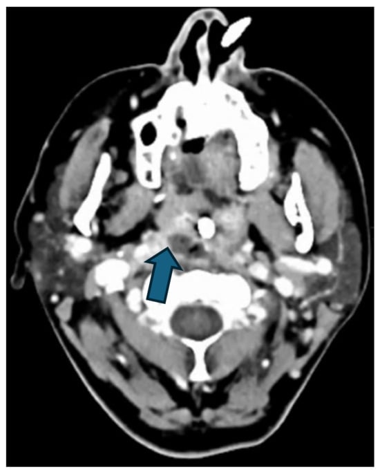 The gold-standard imaging modality for diagnosing DNM is computed tomography (CT) of the neck and thorax [,]. CT scans are crucial not only for the initial diagnosis but also for identifying residual abscesses and for ongoing surveillance throughout the treatment process []. While magnetic resonance imaging (MRI) provides superior soft-tissue contrast and can be useful in detailing the spread of the infection, its use is often limited due to longer acquisition time, making it less suitable for rapid diagnosis.
