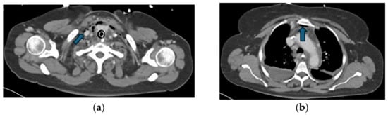 CT findings of the same patient presented in Figure 2, demonstrating the progression of DNM. (a) Gas inclusions (blue arrow) extending along the platysma muscle and thyroid gland into the anterior mediastinum; (b) Gas inclusions (blue arrow) posterior to the manubrium sterni with right sided pleural effusion.