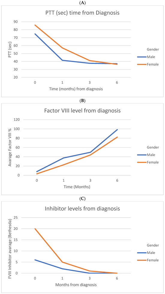 (A) Prothrombin time (PTT) in seconds over time (months) from diagnosis in male and female patients with acquired hemophilia A. Initial PTT levels were elevated in both genders, with a progressive decrease observed during follow-up, reaching comparable levels by six months post-diagnosis. (B) Average factor VIII levels (%) over time (months) from diagnosis in male and female patients with acquired hemophilia A. Both genders showed progressive increases in factor VIII levels during follow-up, with males demonstrating slightly higher levels by six months. (C) Average factor VIII inhibitor levels (%) over time (months) from diagnosis in male and female patients with acquired hemophilia A. Both genders showed progressive decrease in factor VIII inhibitor levels during follow-up period.