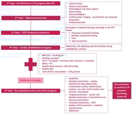 Cardiac rehabilitation program in patients after a percutaneous coronary intervention: tailored assessment and management. BMI, body mass index; CPET, cardiopulmonary exercise test; CR, cardiac rehabilitation; HbA1c, glycated hemoglobin; LDL-C, low-density lipoprotein cholesterol; PCI, percutaneous coronary intervention.
