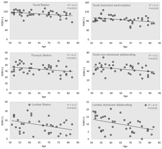 - Intolo, P.; Milosavljevic, S.; Baxter, D.G.; Carman, A.B.; Pal, P.; Munn, J. The effect of age on lumbar range of motion: A systematic review. Man. Ther. 2009, 14, 596–604. [Google Scholar] [CrossRef] [PubMed]