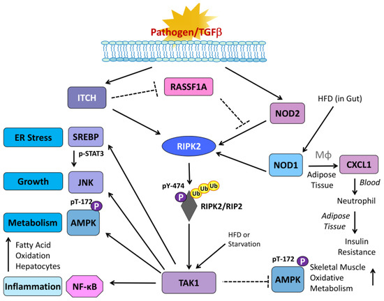 Model for RIPK2 signaling. RIPK2 is emerging as a key player in driving inflammation, metastasis and possibly metabolism. It has been documented that RIPK2 kinase activity is controlled by phosphorylation and K-63 ubiquitination events that are controlled by associations with NOD, mainly NOD2, in response to pathogen exposure. We have unpublished evidence that the tumor suppressor, RASSF1A, can restrict access of RIPK2 to NOD2 and thus regulate RIPK2 kinase activity (unpublished information). In addition, the E3 ligase, ITCH can ubiquitinate RIPK2 upon TGFβ addition to stabilize RIPK2 and drive inflammation and ubiquitinate RASSF1A to degrade it (and thus promote inflammation). Once activated, TAK1 is the immediate downstream target of active RIPK2 that can then in turn promote the activation of NFκB and modulation of AMPK. Active TAK1 and AMPK will lead to modulation of numerous other signaling events as illustrated, with AMPK described as a key metabolic sensor. NOD1 activation with RIPK2 can lead to CXCL1 secretion from macrophages (MΦ) to result in insulin resistance in specific cell types. High-fat diets or starvation conditions will lead to the activation of NOD1 and TAK1, thus providing another link between inflammation and metabolic perturbations. Please note that this schematic only contains pathways relevant to the discussion in this review. Arrows represent activating signals while others represent inhibitory outcomes. HFD, high-fat diet; ER, endoplasmic reticulum.