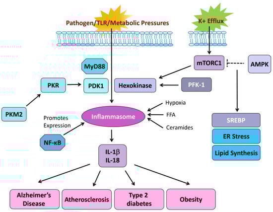 The inflammasome is a multi-protein complex composed of NOD-like domain proteins that can promote the secretion of cytokines such as IL-1β and IL-18 in response to infectious microbes or cellular stress [73]. The nucleotide-binding and oligomerization domain-like receptor, leucine-rich repeat and pyrin domain-containing 3 (NLRP3) inflammasome is the best-characterized inflammasome in humans and mice composed of an adaptor protein and procaspase-1 [74]. The assembly of the inflammasome complex will trigger the cleavage of procaspase-1 to p10 and p20 products that will in turn activate pro-IL-1β and pro-IL-18 into their active products, IL-1β and IL-18 [75]. High amounts of caspase-1 will trigger “pryoptosis” or caspase-1-mediated cell death. It is currently known that, in addition to pathogen stimuli, the inflammasome is also influenced by metabolic changes such as changes in glycolysis, membrane electrolyte fluxes and mitochondrial stress. Because of these aforementioned observations of the inflammasome, a number of recent publications have implicated the activation of the NLRP3 inflammasome to a variety of metabolic diseases including obesity, atherosclerosis and type 2 diabetes [76]. It was speculated that under normal physiology, the NLRP3 inflammasome complex maintained metabolic balance. However, upon chronic activation (e.g., in obesity or hypercholesterolemia), NLRP3 became pathologic and promoted disease [77]. Figure 2 schematically illustrates the complexity of inflammasome biology, including important links to metabolic signaling. It has been documented that K+ efflux agonists enhance mTORC1 activation, increasing expression of hexokinase 1 (HK1) and leading to NLRP3 activation [77]. Pyruvate kinase, isoform M2 (PKM2)-dependent expression of pyruvate dehydrogenase kinase 1 (PDK1) and the resulting phosphorylation of PKR have also been linked to K+ efflux, resulting in the stimulation of inflammasome signaling [73]. The relative expression and activity of PKM2 and PDK1 control the fate of pyruvate and play a major role in the cancer-related “Warburg effect”, mechanistically implying a role of the inflammasome in tumor metabolism.